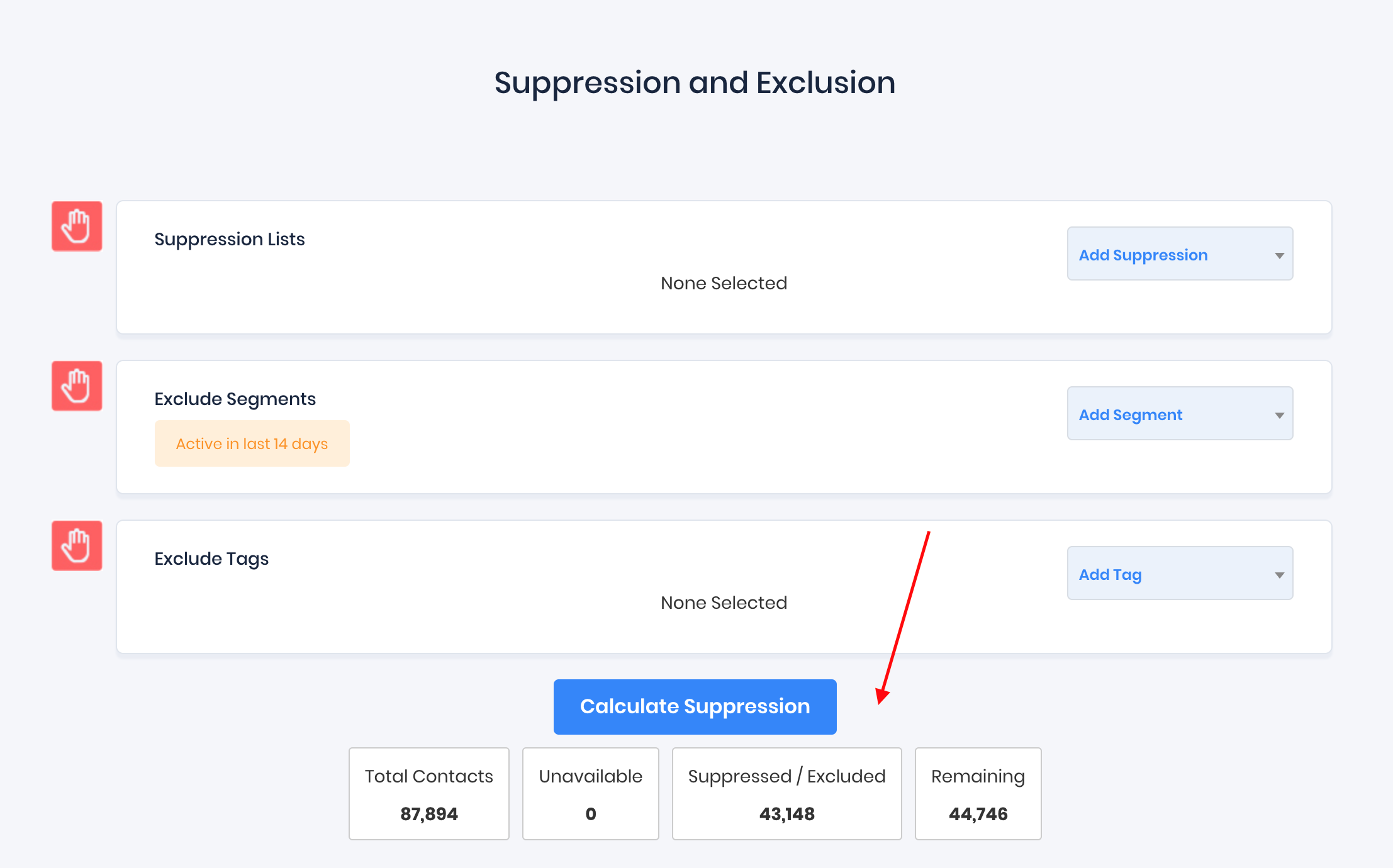 You can exclude and suppress contacts by selecting suppression lists you've uploaded, segments, or tagged contacts.