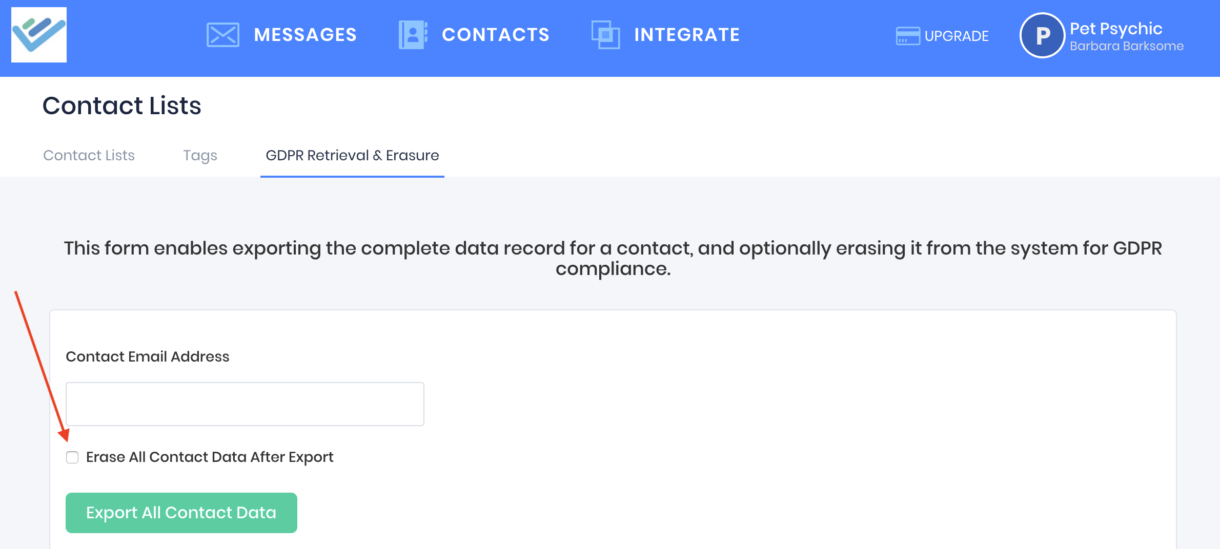 Check "Erase All Contact Data After Export" to purge all data associated with the contact. This will permanently delete all known data with a full erasure, and is not an unsubscribe.