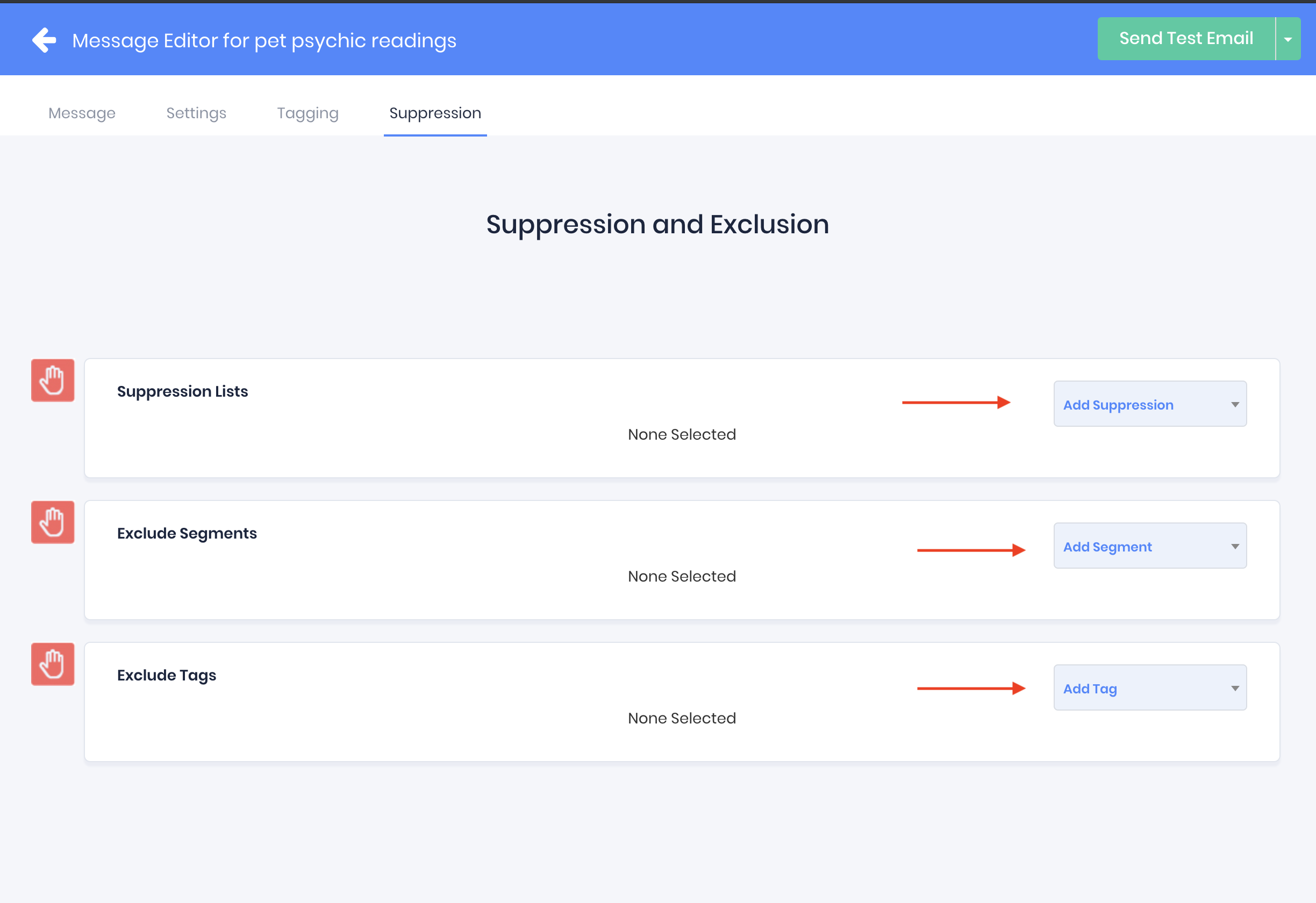 You can exclude and suppress contacts from receiving a funnel message by selecting suppression lists you've previously uploaded, or by selecting segments or contacts that have had a tag applied to them