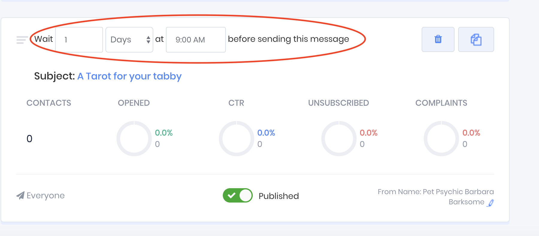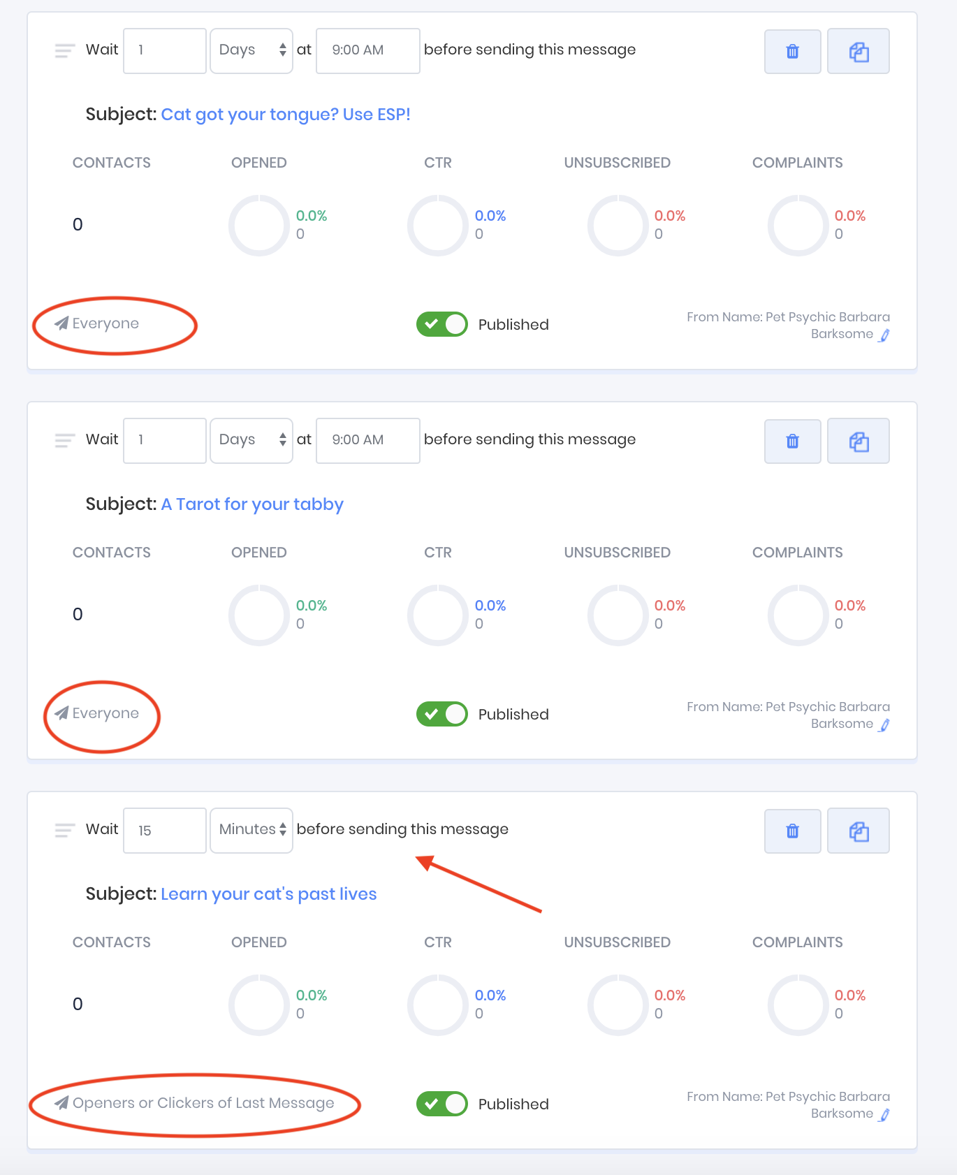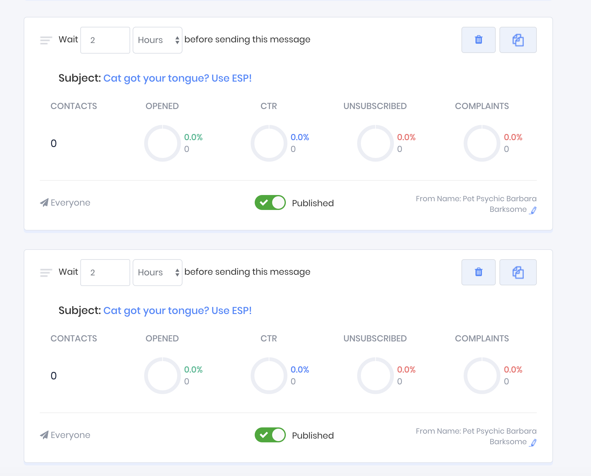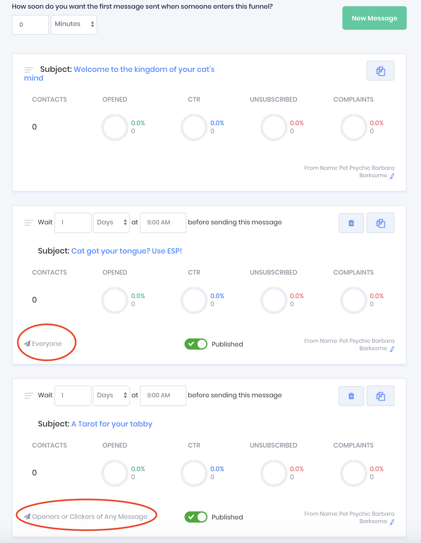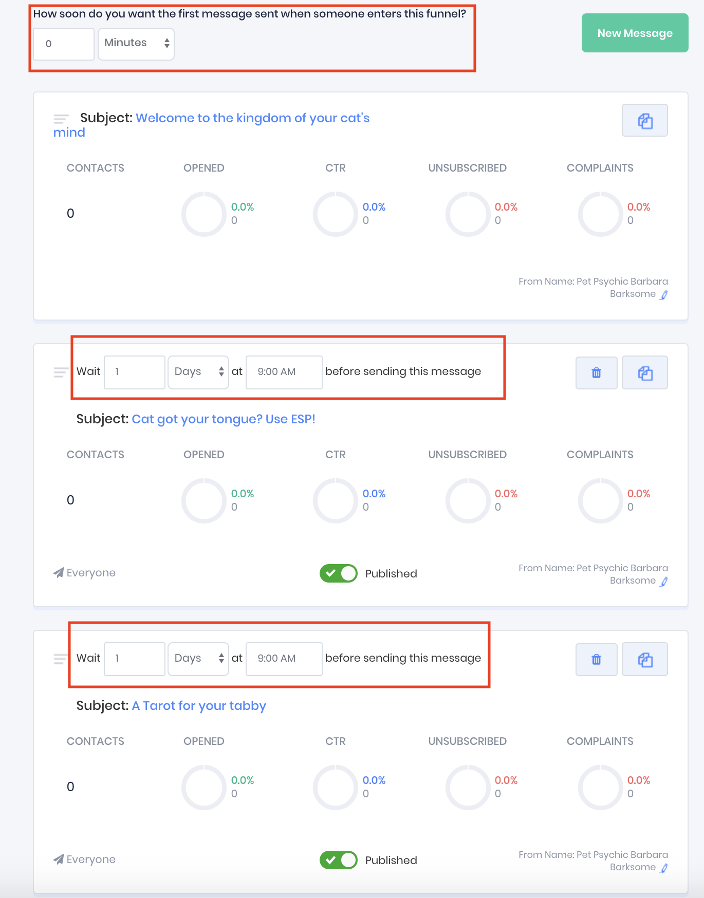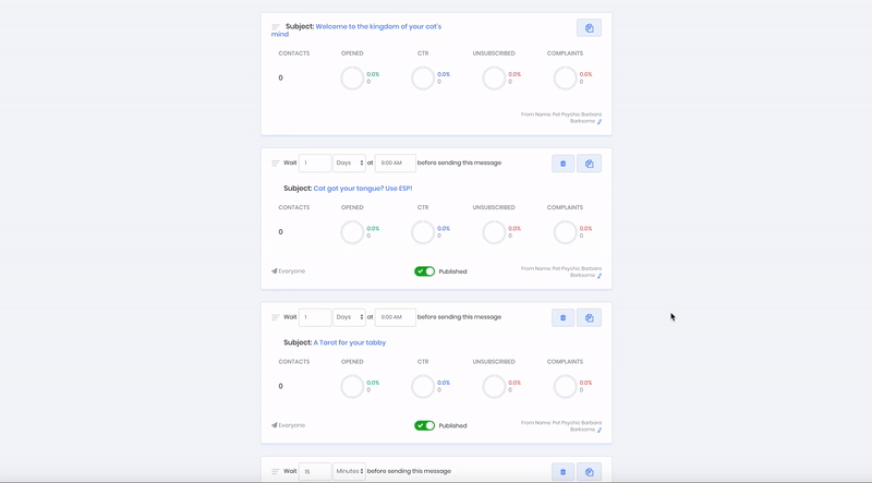 In the following example the message with the subject line "A tarot for your tabby" will be sent 2 days after the contact has been added to the funnel, and 24 hours after the contact was sent the message with the subject line "Cat got your tongue? Use ESP!".