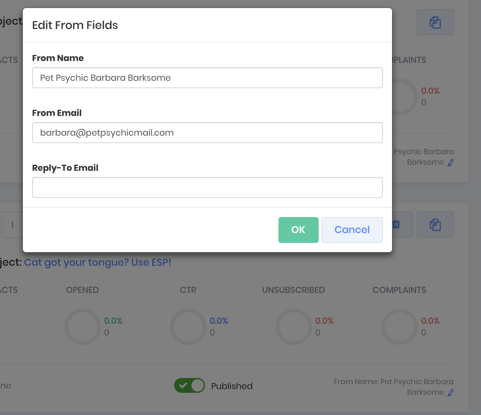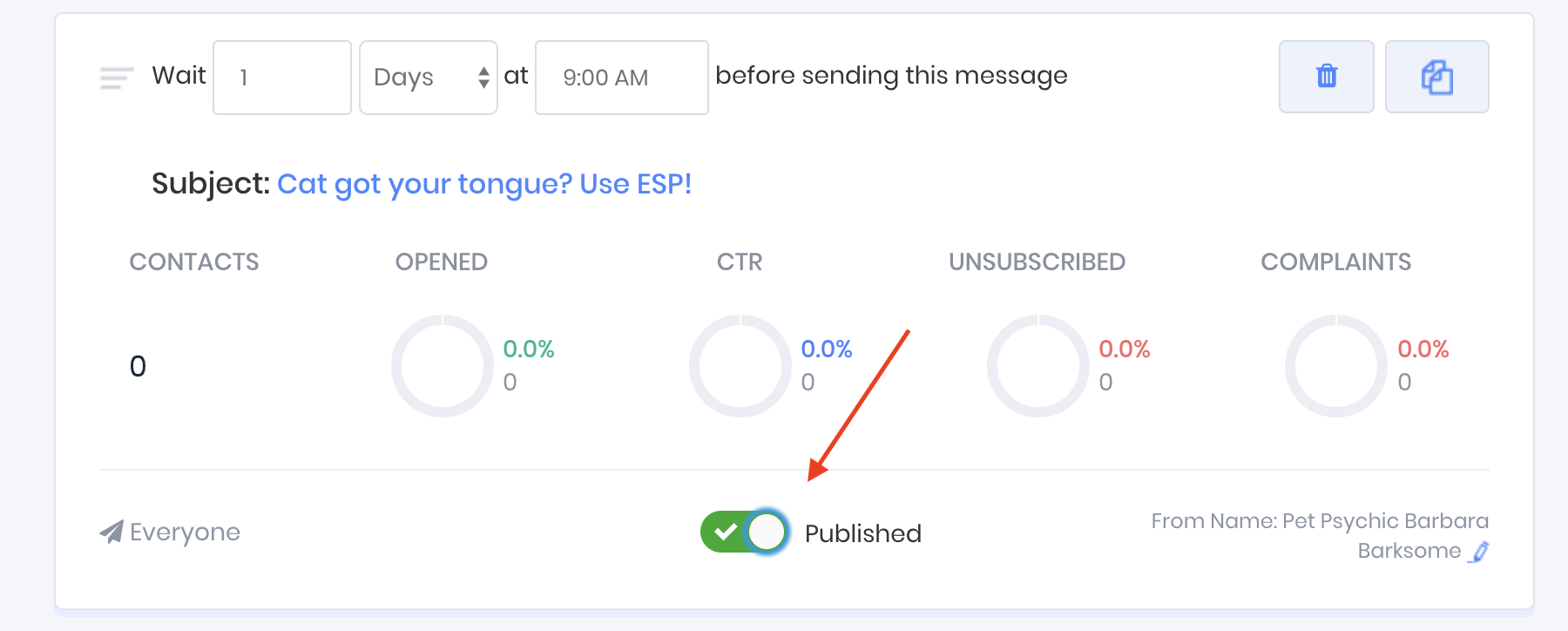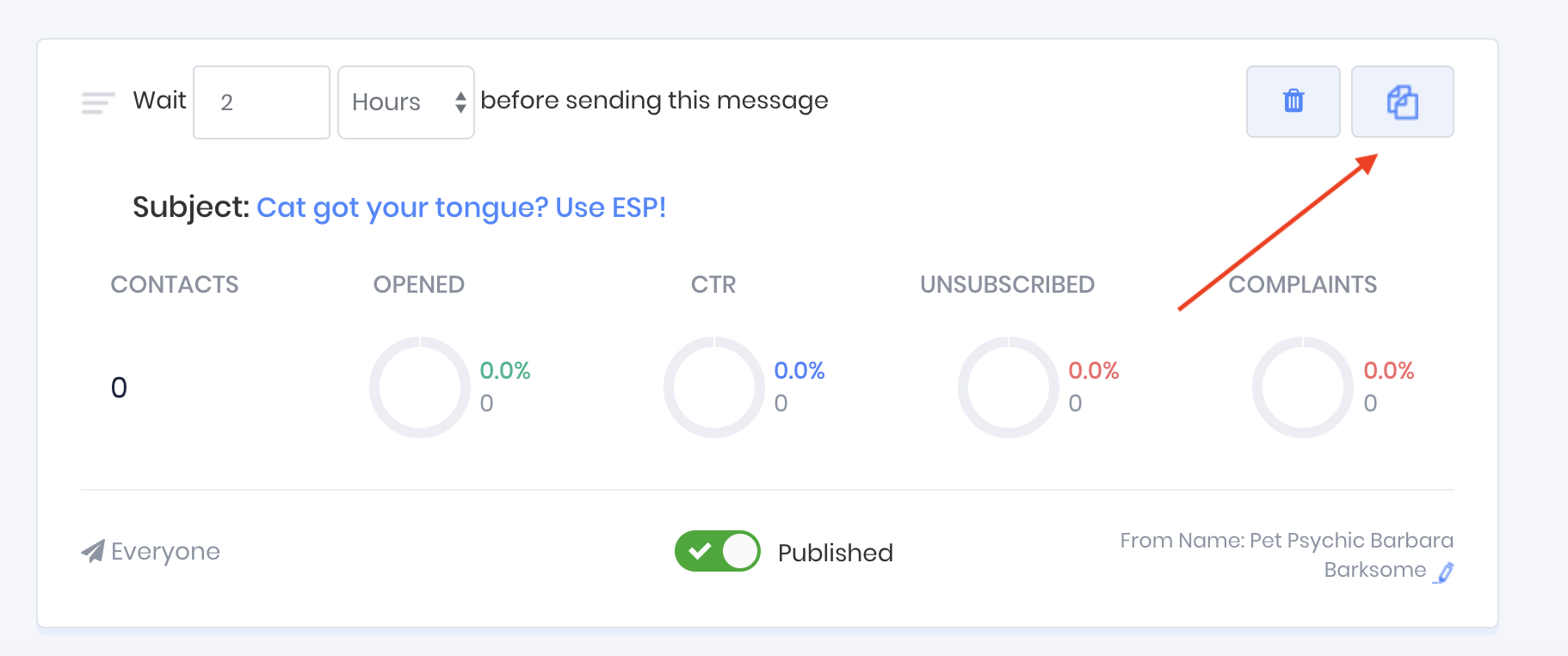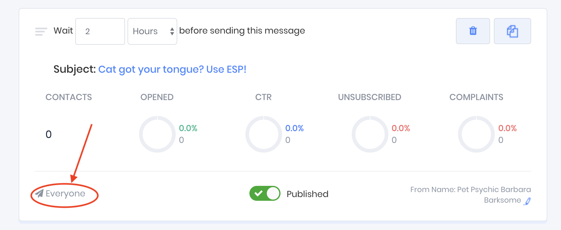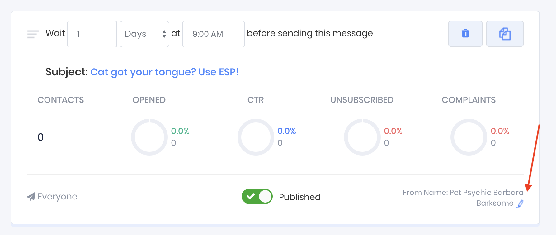 In the following example the message with the subject line "A tarot for your tabby" will be sent 2 days after the contact has been added to the funnel, and 24 hours after the contact was sent the message with the subject line "Cat got your tongue? Use ESP!".