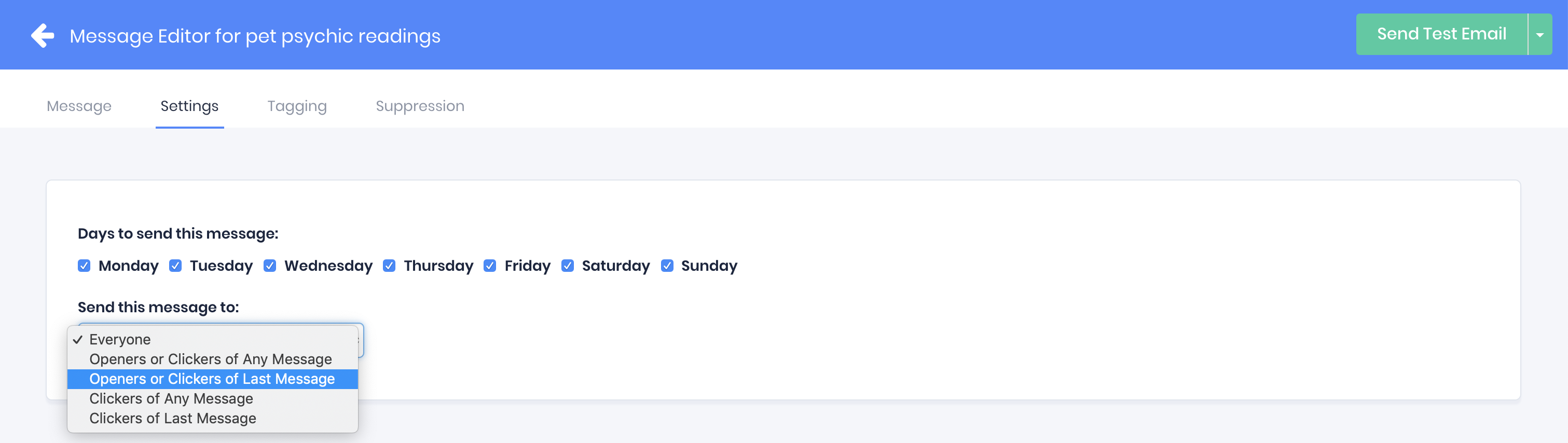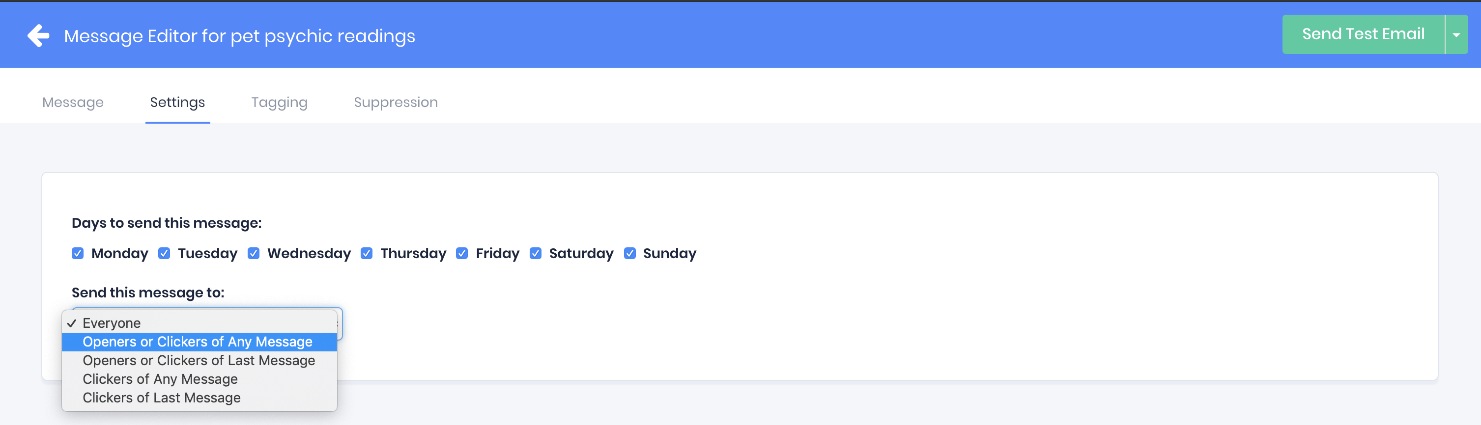 To modify who will receive a message, click the "send this message to" dropdown in the settings tab