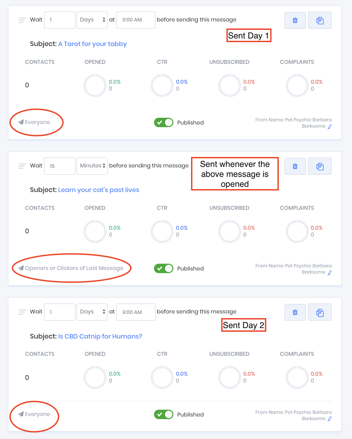 However, the message "A tarot for your tabby" will only be sent IF the contact opened one of the prior two messages, otherwise, the message will not be sent at all.