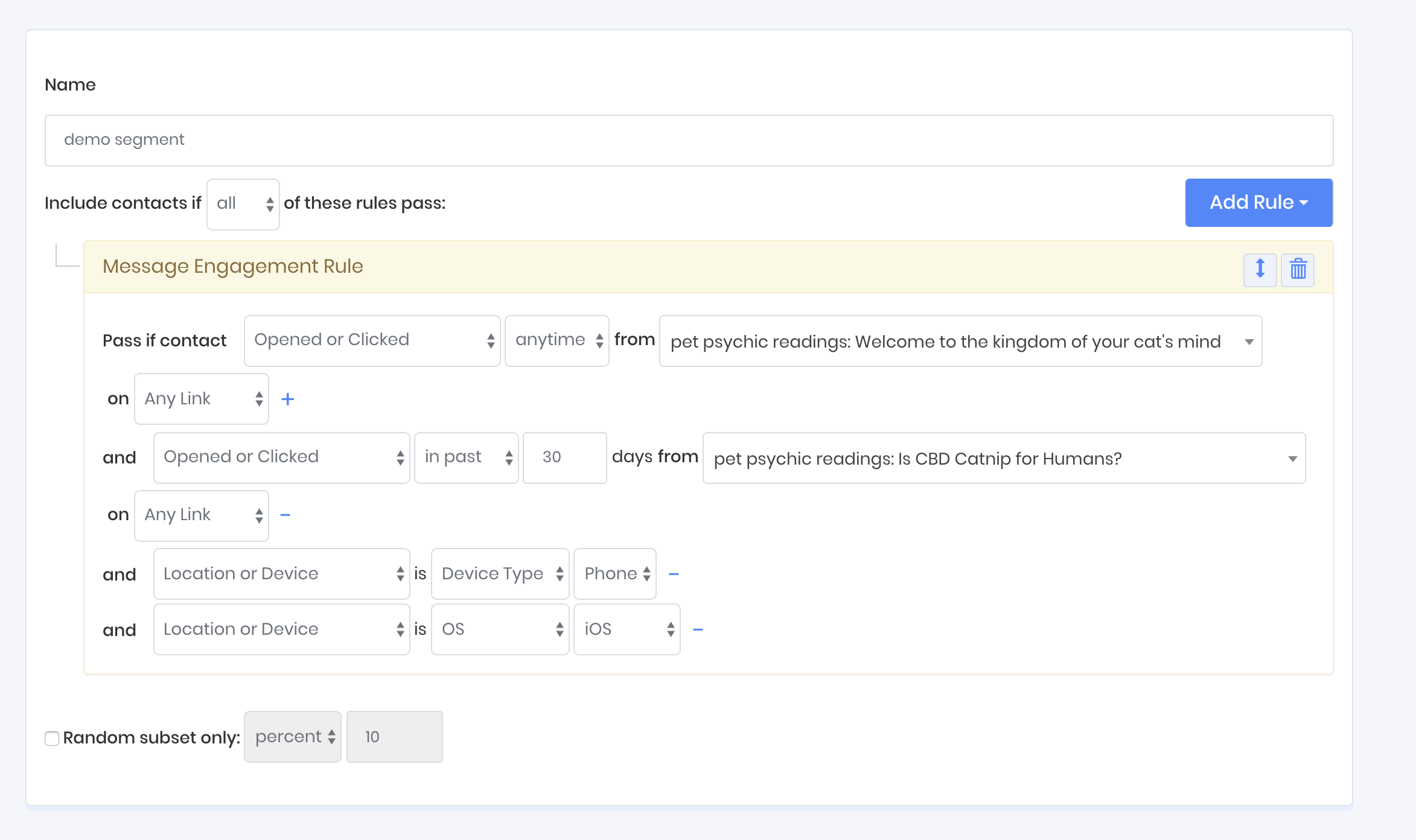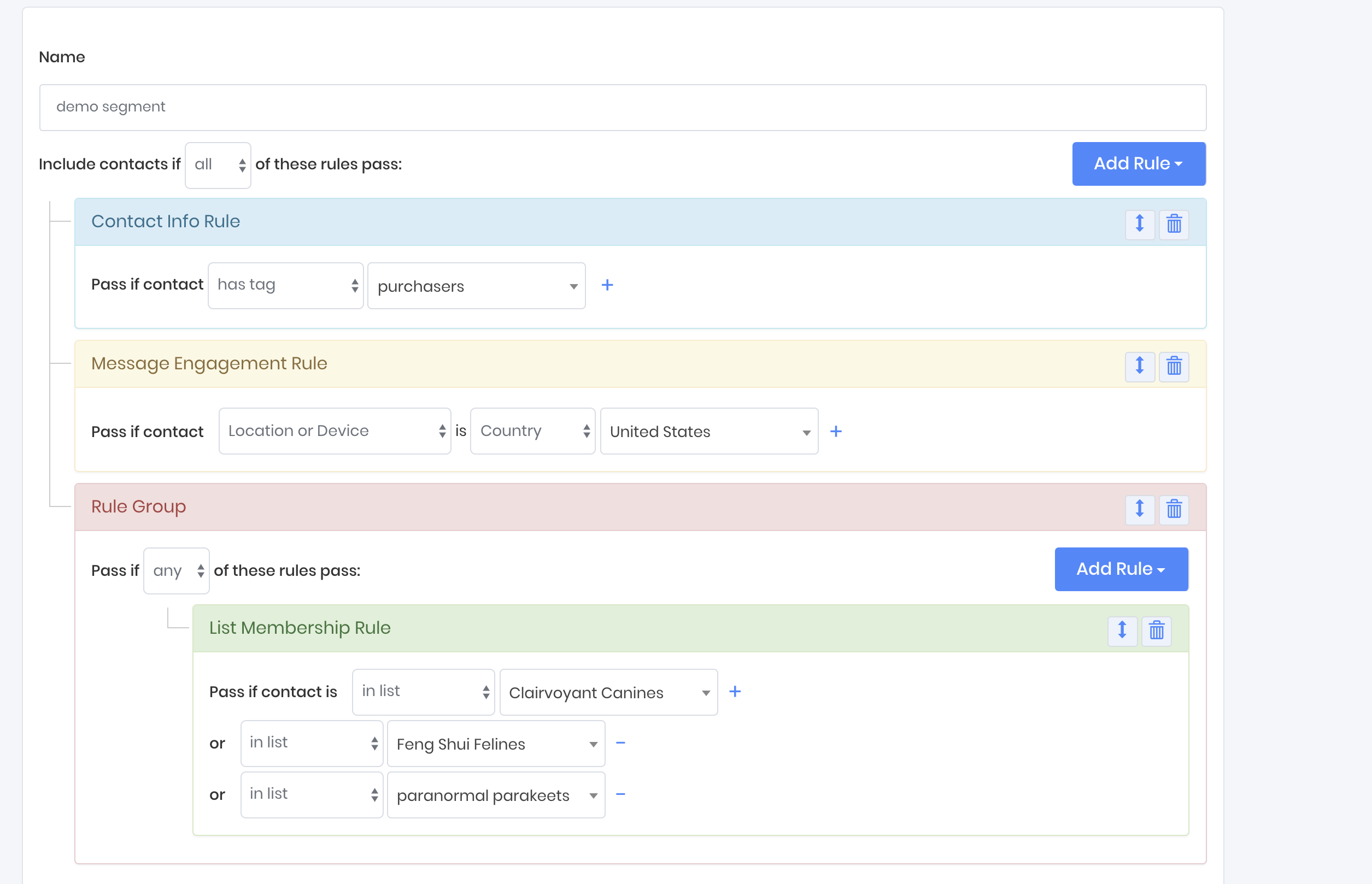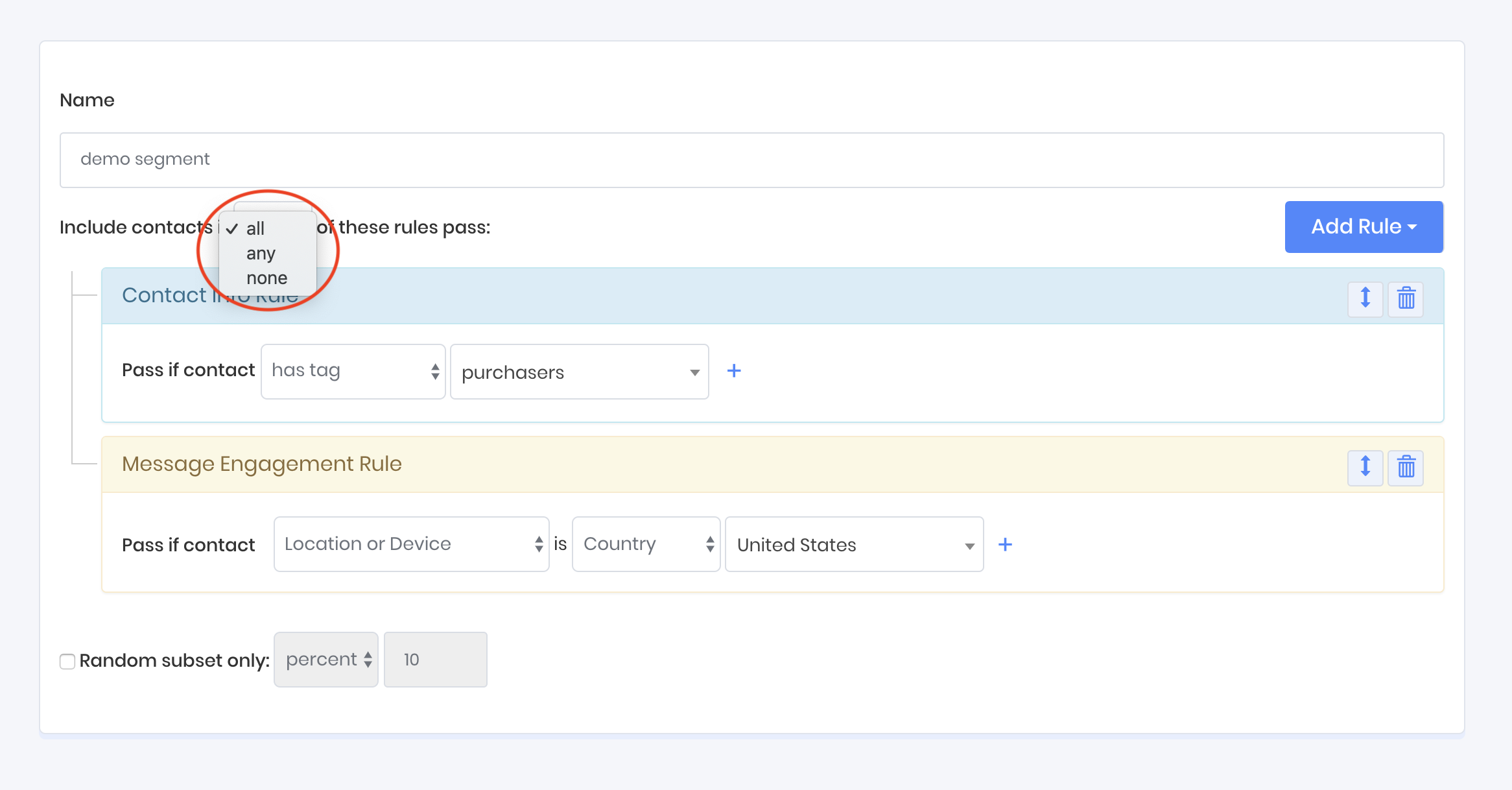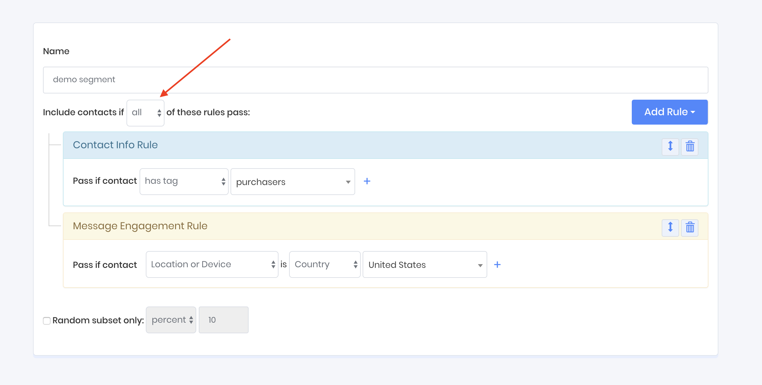 Here we search for contacts tagged as purchasers who have opened their emails from America, but only if they exist in at least one of three specified contact lists.