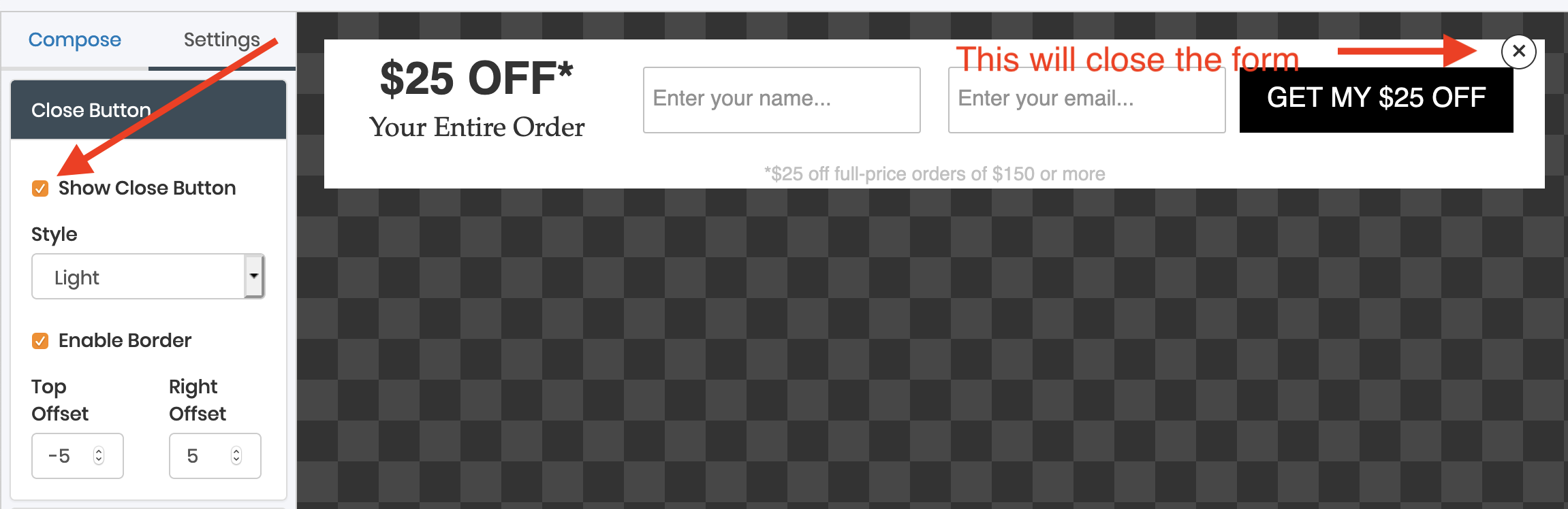 To move the location of your close window X around, adjust the offsets using the up and down arrows in the left sidebar