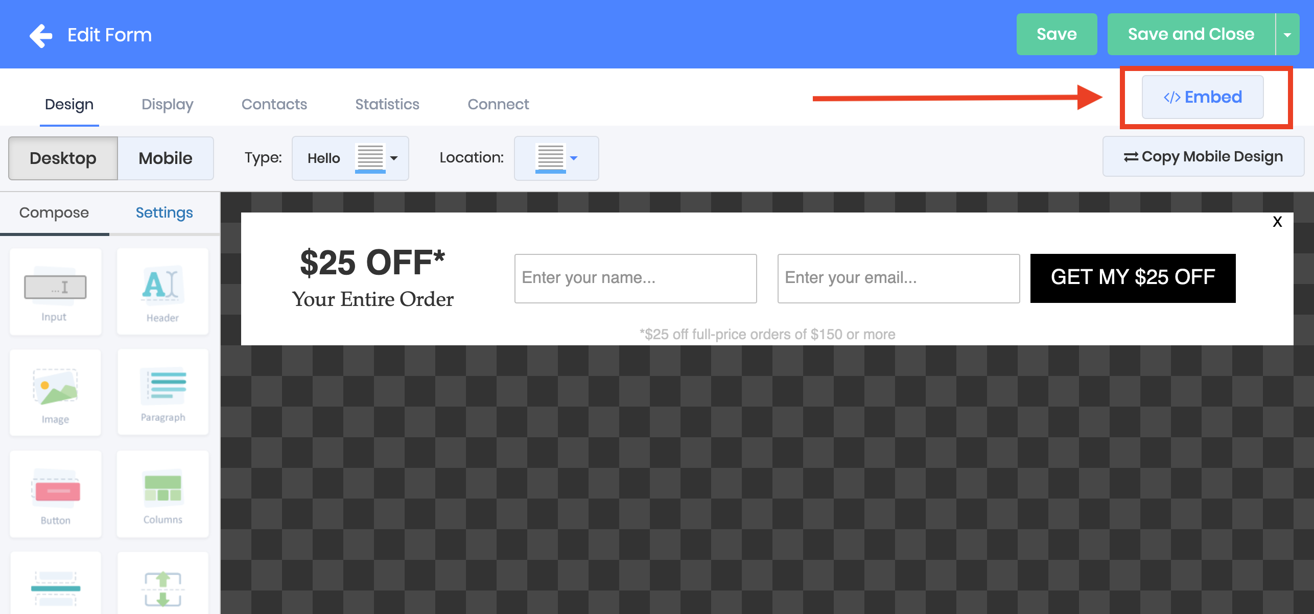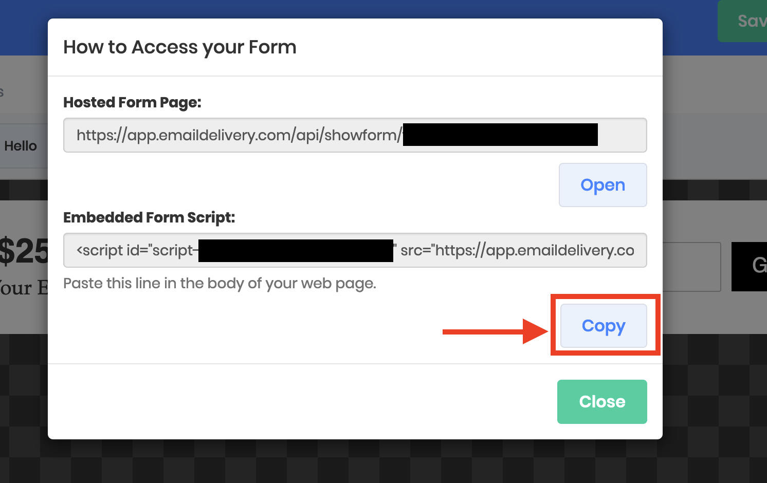 Click the copy button to copy the form script to your paste buffer automatically, then paste the code into the <body> tag in the html on your site