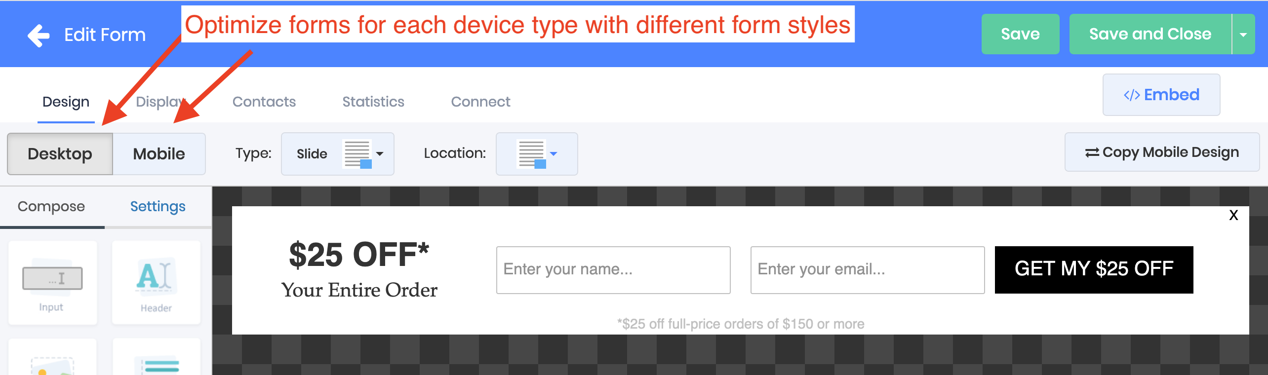 You can use a modal popup on desktop and a hello footer on mobile and every other combination you can dream up when you optimize the two versions of your form for different device types
