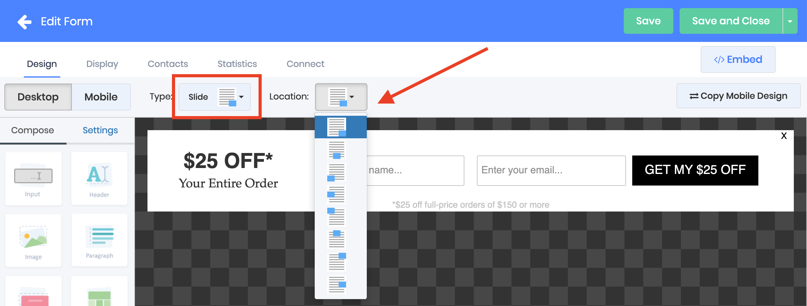 Choose "Slide" from the "Type:" drop down, then select the location you want the form to slide in from on the page in the "Location:" drop down