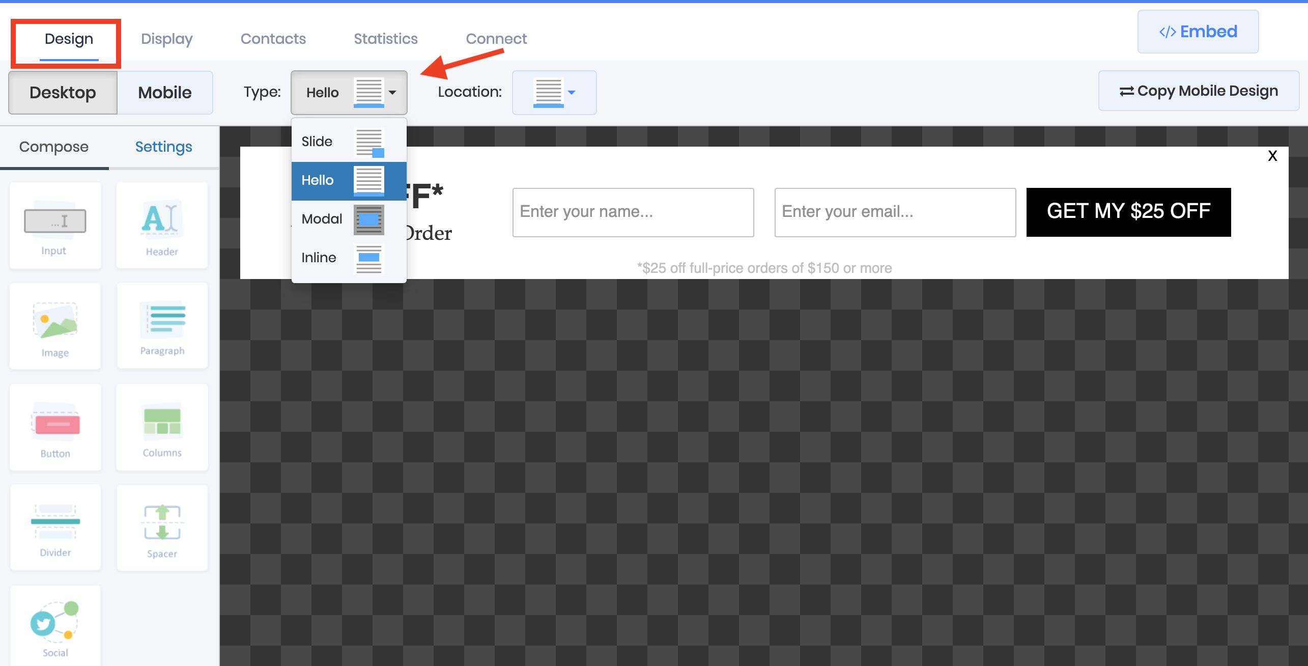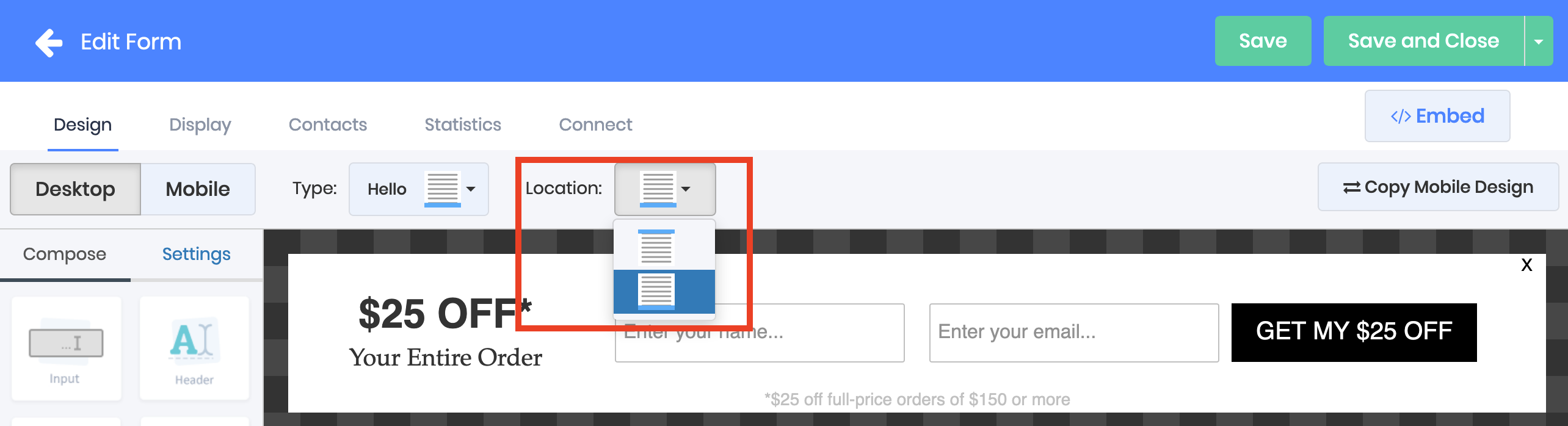 Choose whether your want your Hello form to appear at the top or bottom of the page by using the Location dropdown