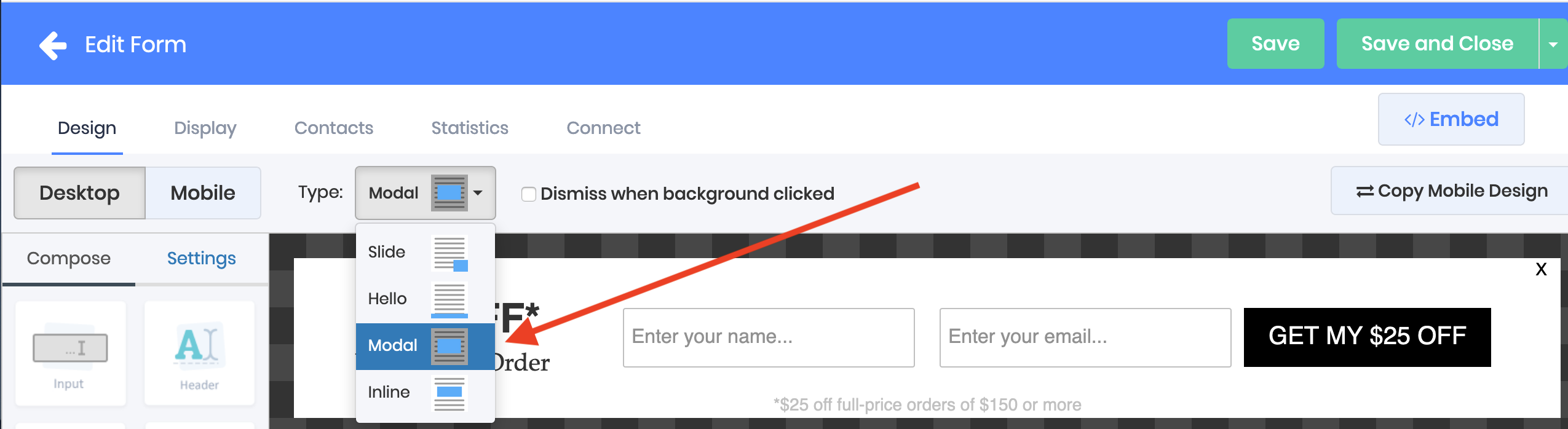 Choose "Modal" from the "Type:" drop down to have your form act as a modal