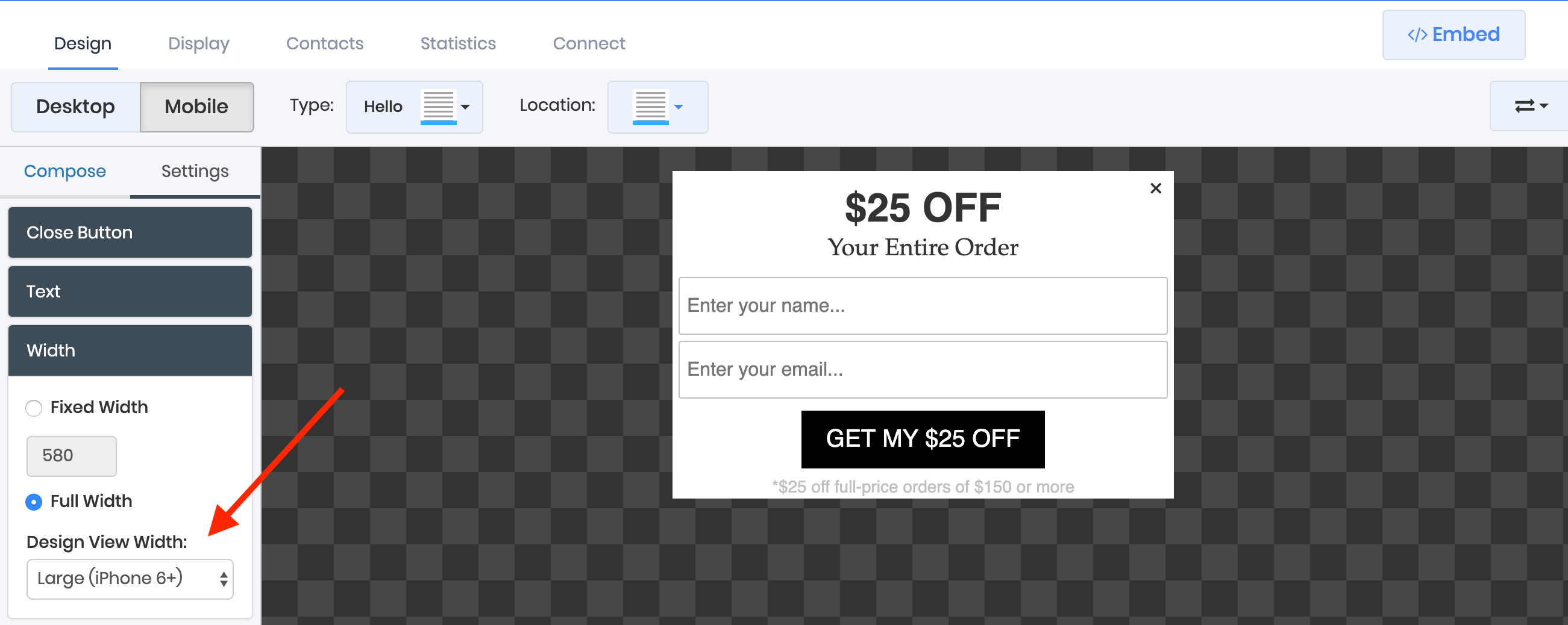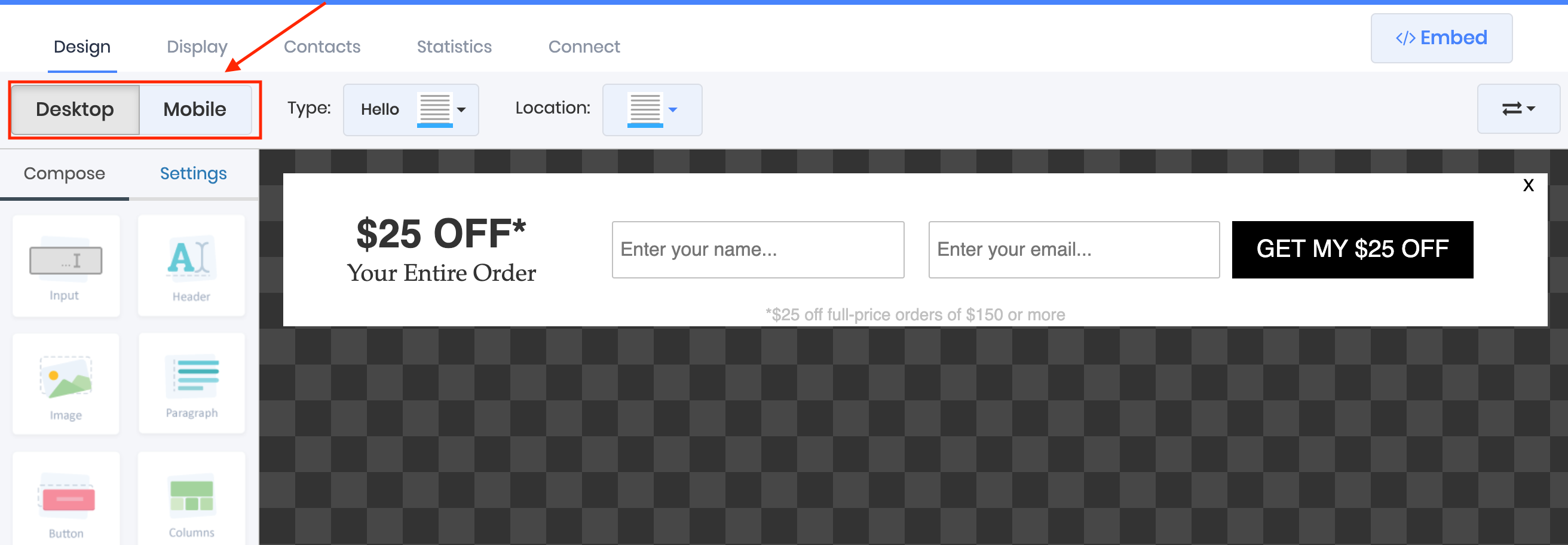 You can design entirely different forms and form styles for desktop and mobile visitors. Click the tabs to alternate between the two versions of your form