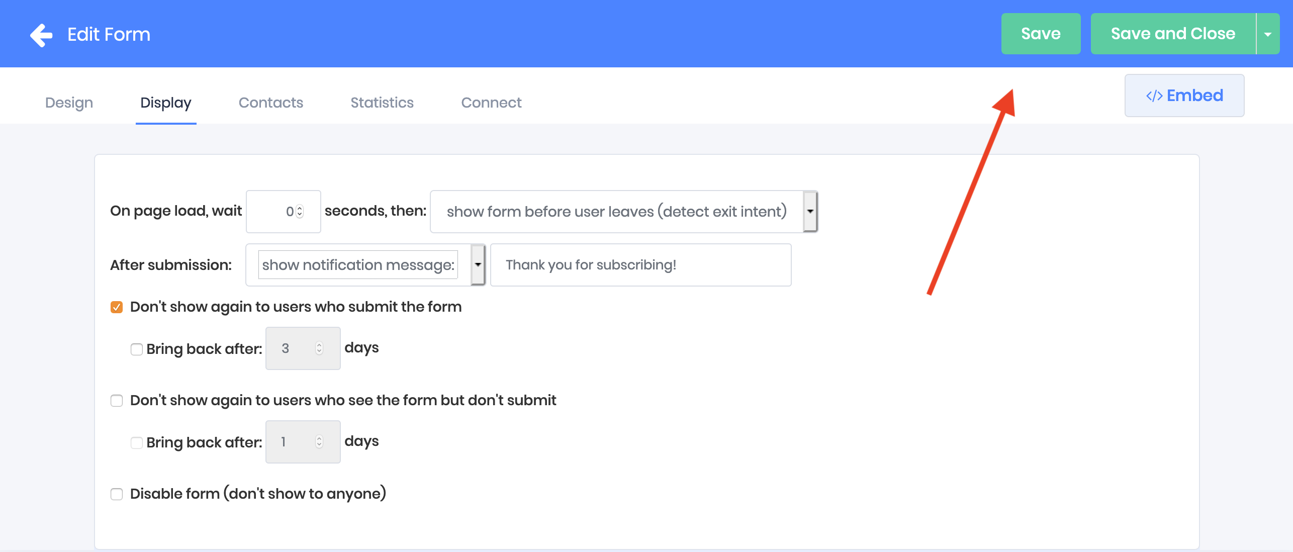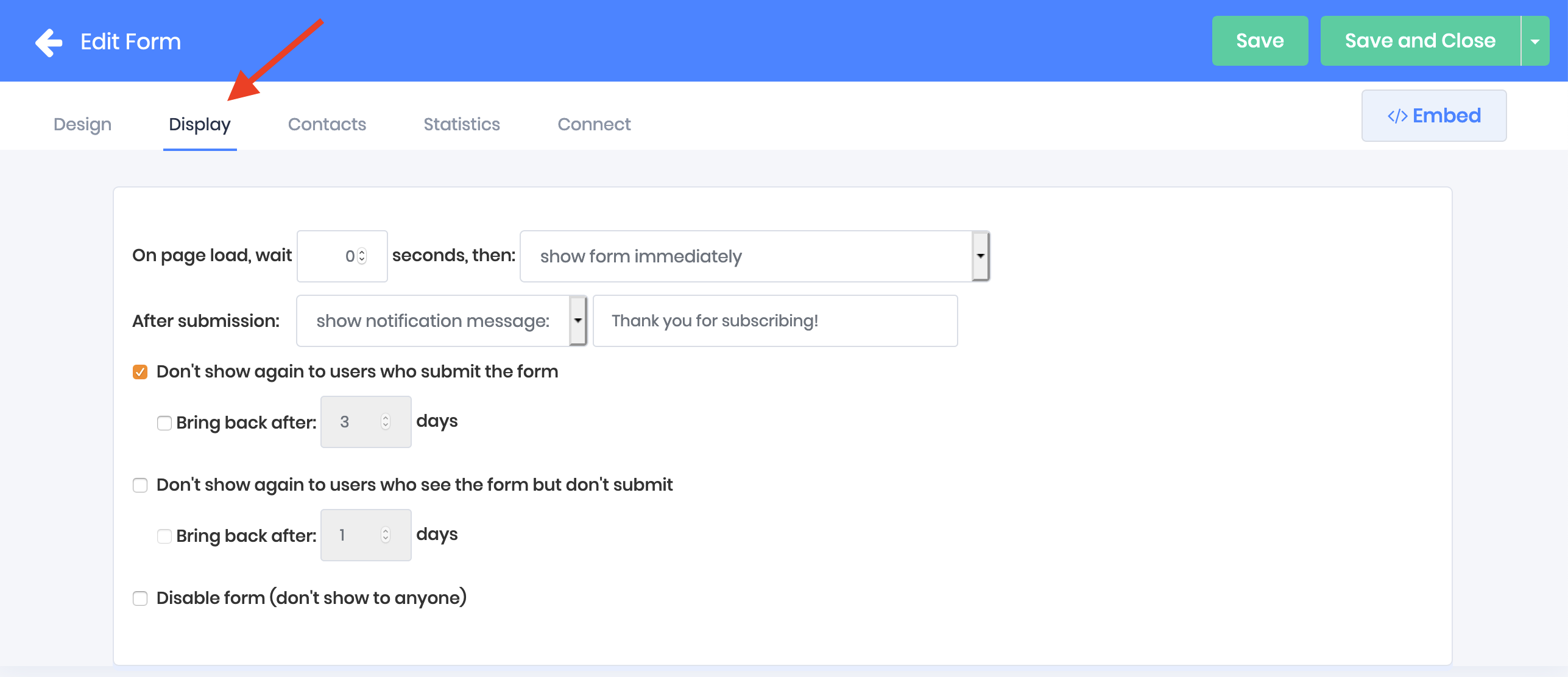 By default, visitors will be shown your form every time the page is loaded until they subscribe. Once they subscribe, the form then stop being shown to them. You can modify those settings here