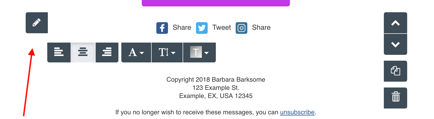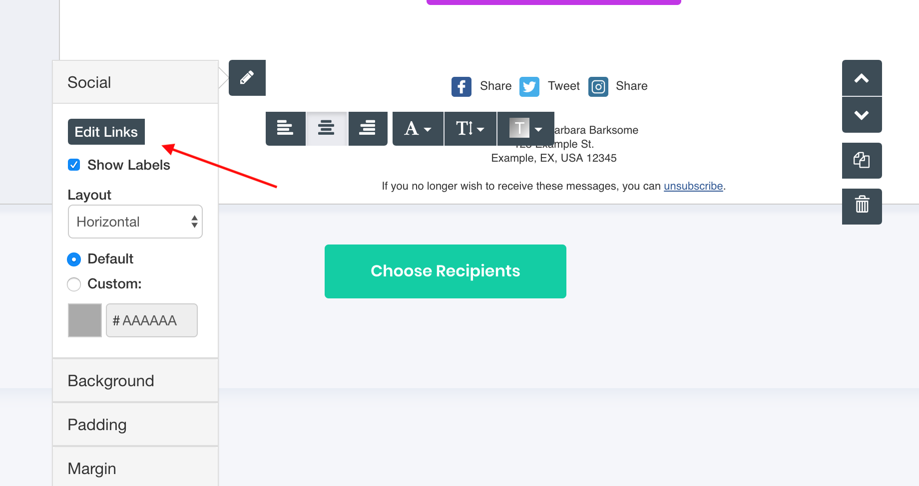 To configure your social media links, drop the social component onto your message, click on the section, which opens the toolbar.