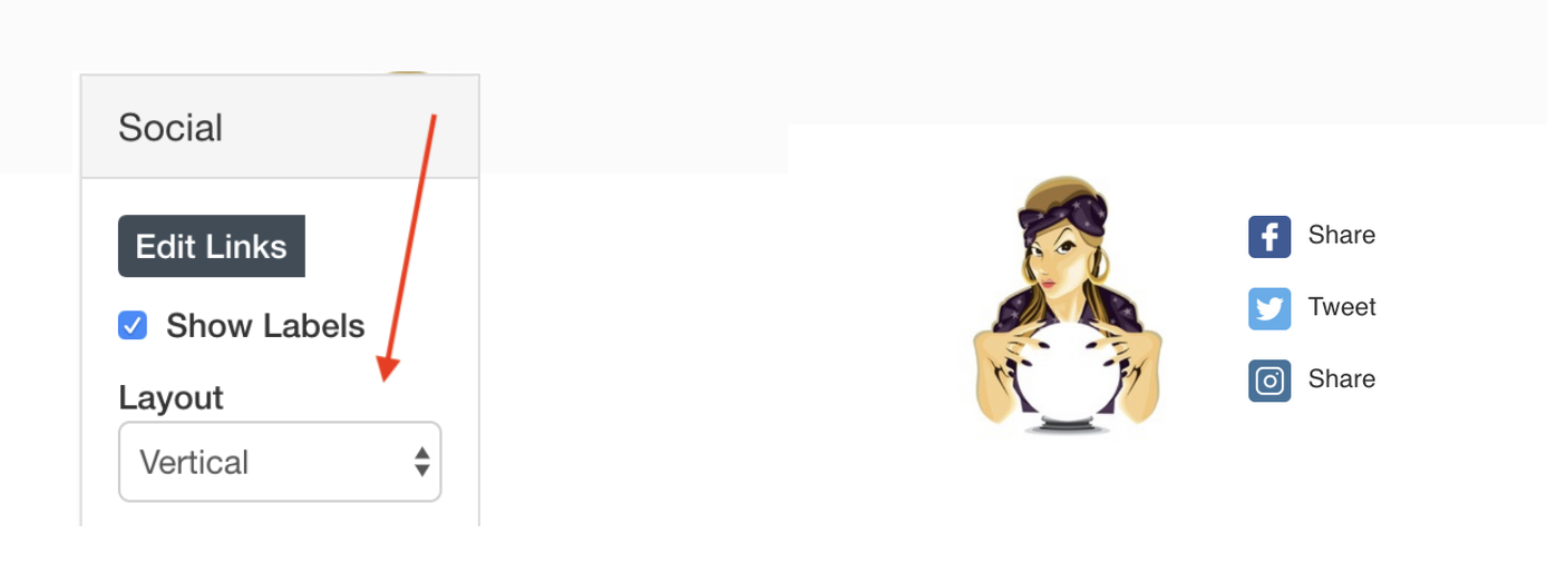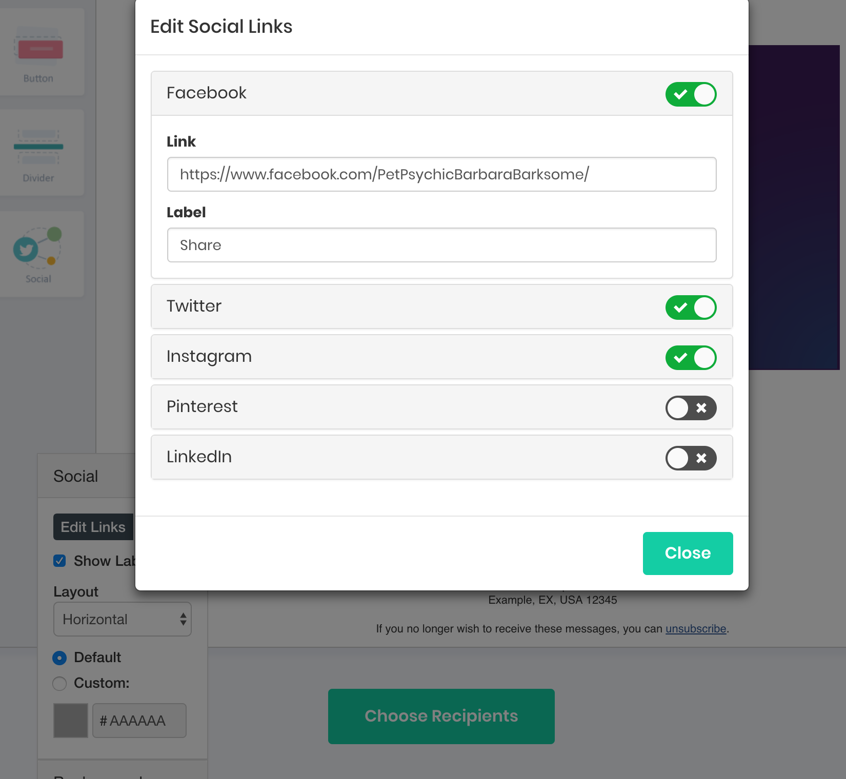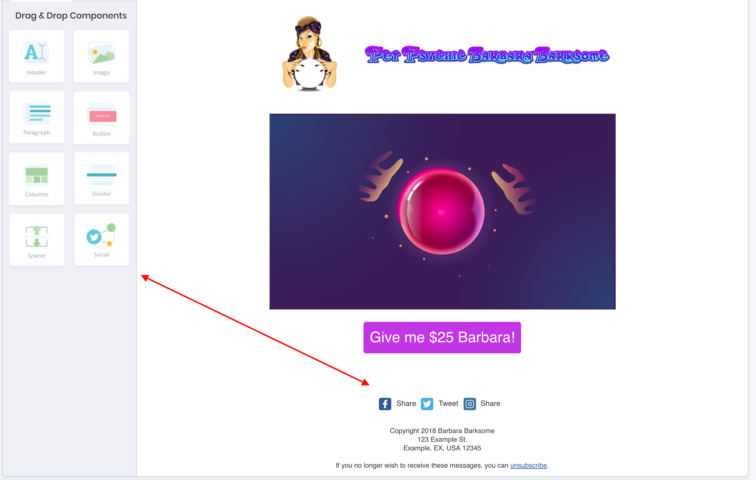 The social media component stores your social media links so you can easily drag-and-drop them onto your template.
